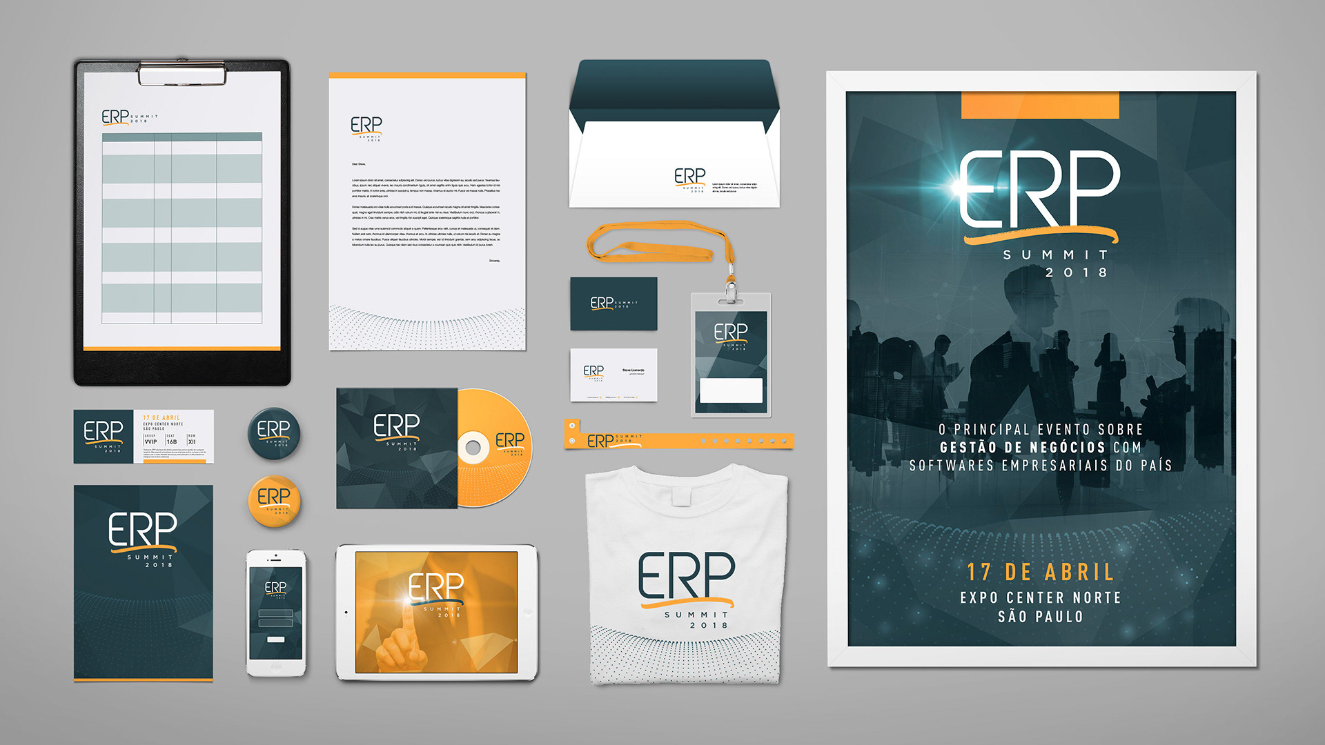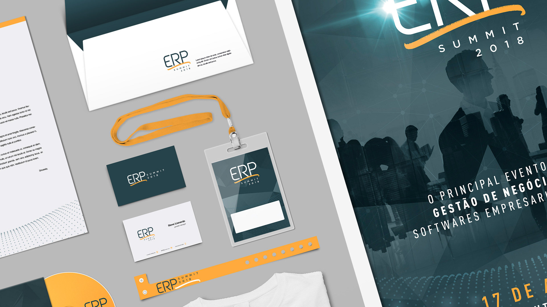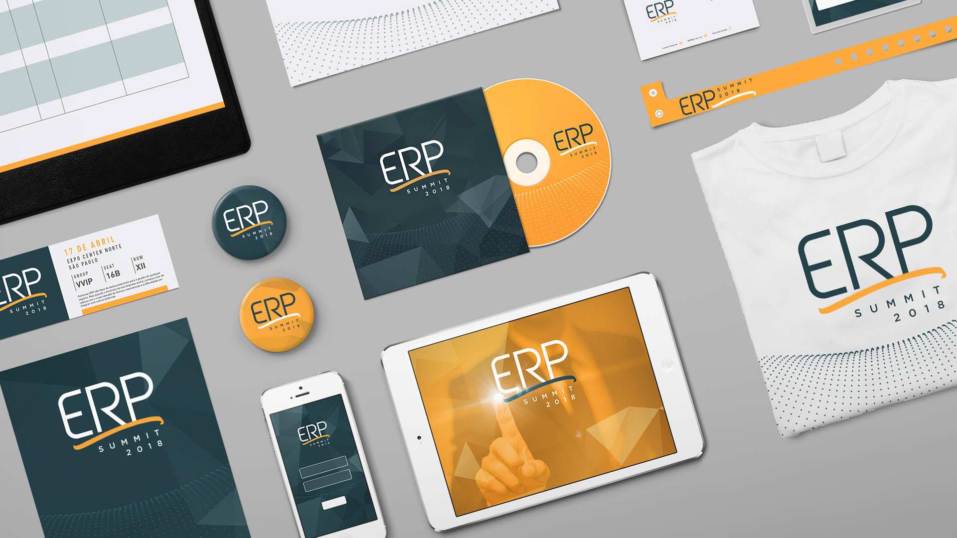 Identidade Visual do evento ERP Summit 2018. Projeto desenvolvido através da Agência InsideOut/RJ.