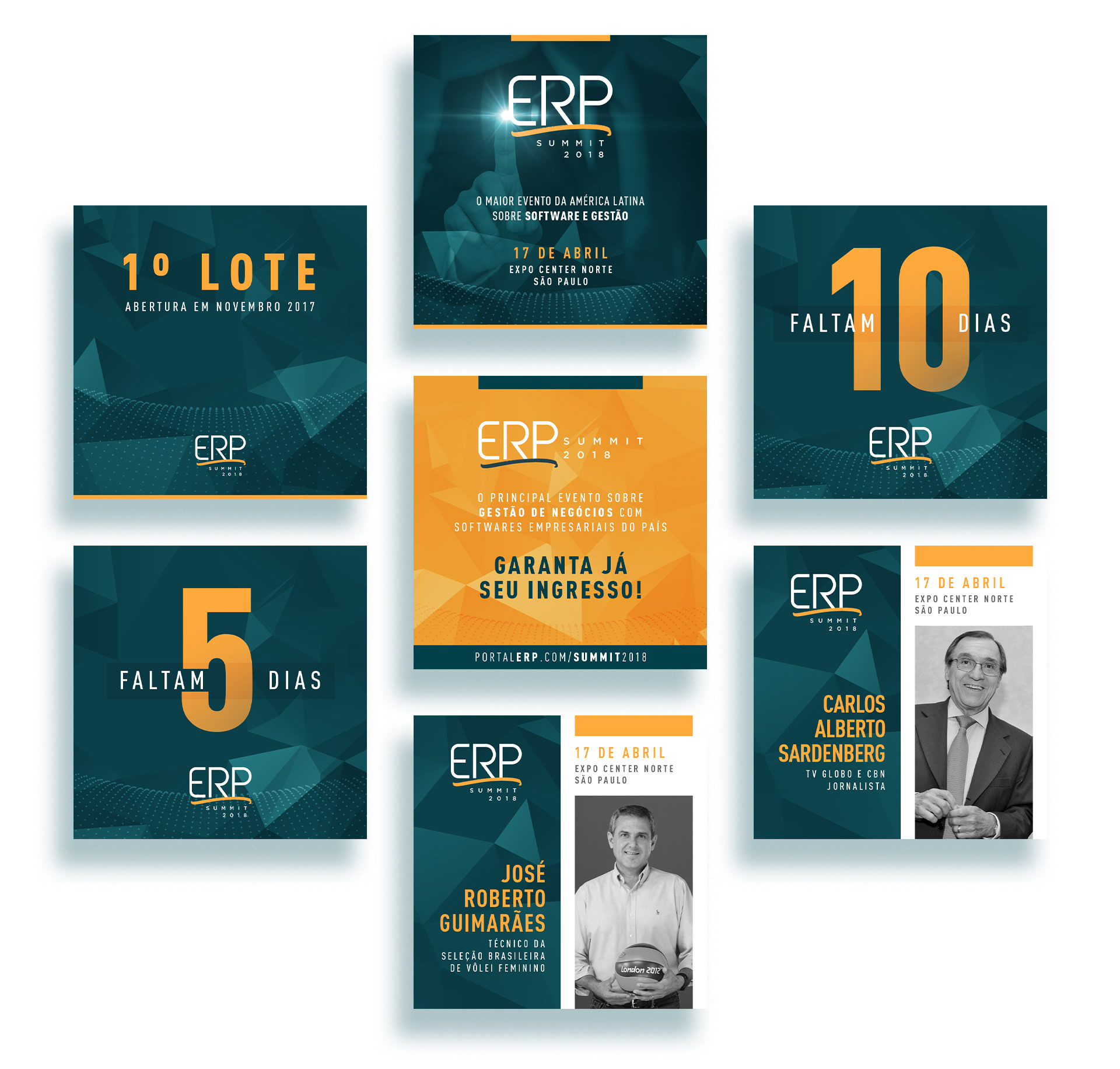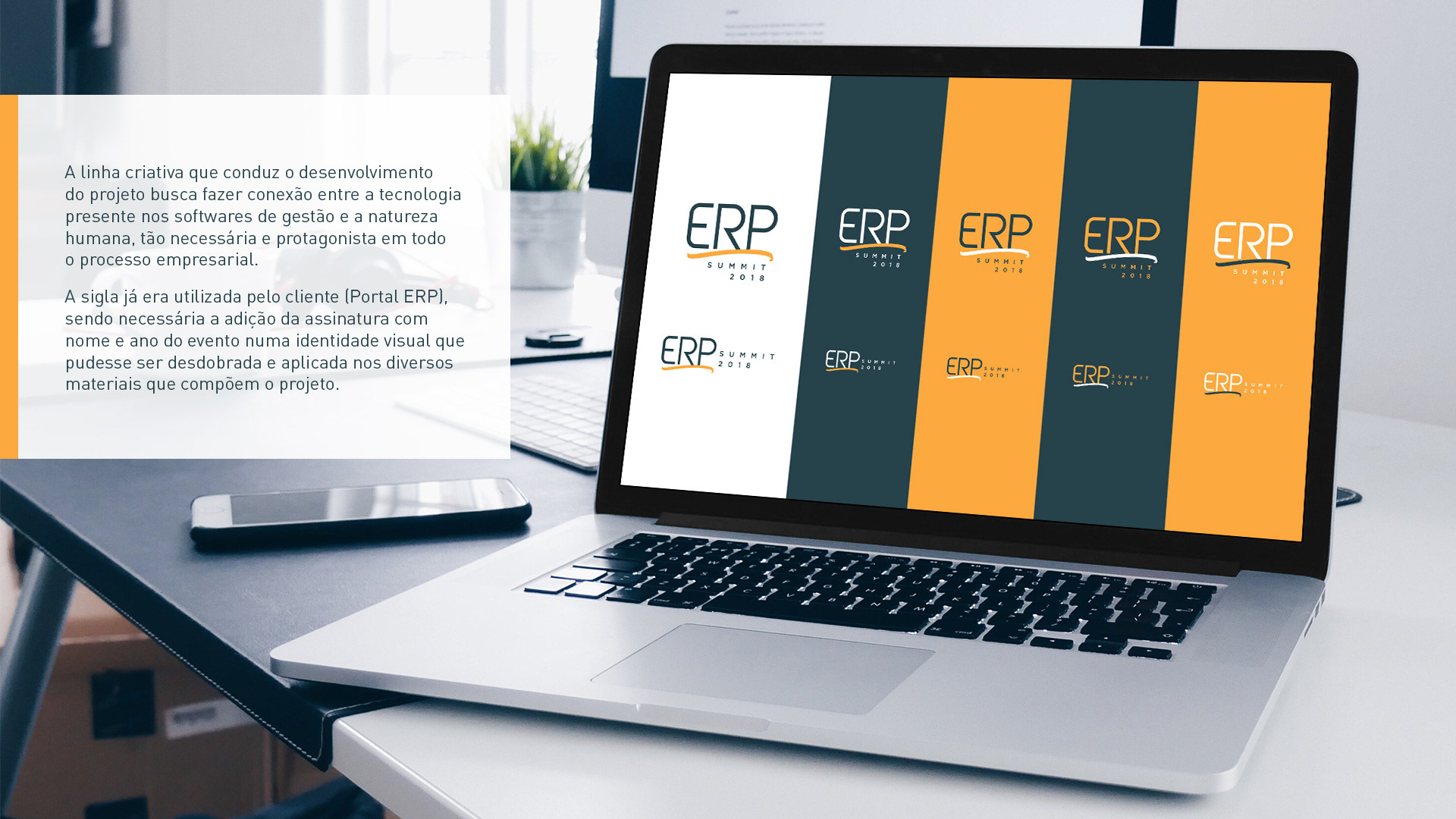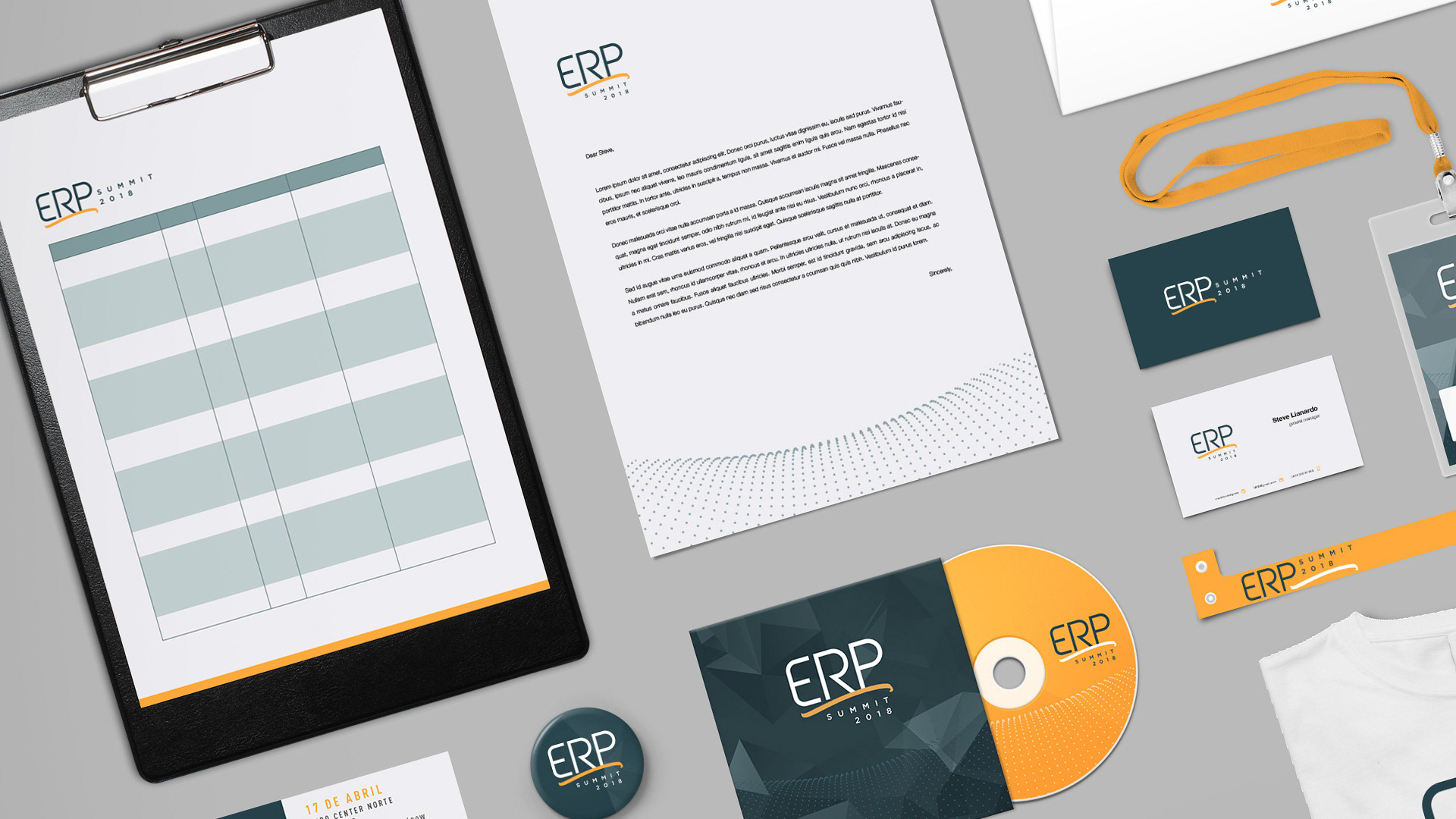 Identidade Visual do evento ERP Summit 2018. Projeto desenvolvido através da Agência InsideOut/RJ.